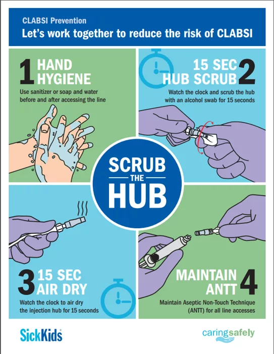 Children may be discharged from hospital to the community with a central venous access device (CVAD) for intravenous medication/fluid administration. Care for a CVAD may include flushing, heparin locking and/or bloodwork. A potential risk of having a CVAD is developing a Central Line Associated Blood Stream Infection (CLABSI).Â