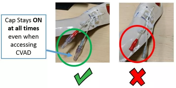 - When cleaning or accessing a CVAD for flushing, heparin locking or bloodwork, best practice is to always keep the CVAD cap on and attach syringes directly to the cap. The cap on a central line protects a key site where bacteria can potentially enter the bloodstream and cause a CLABSI.