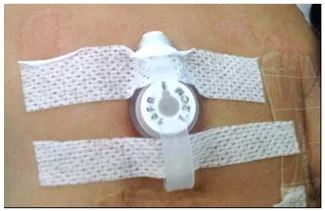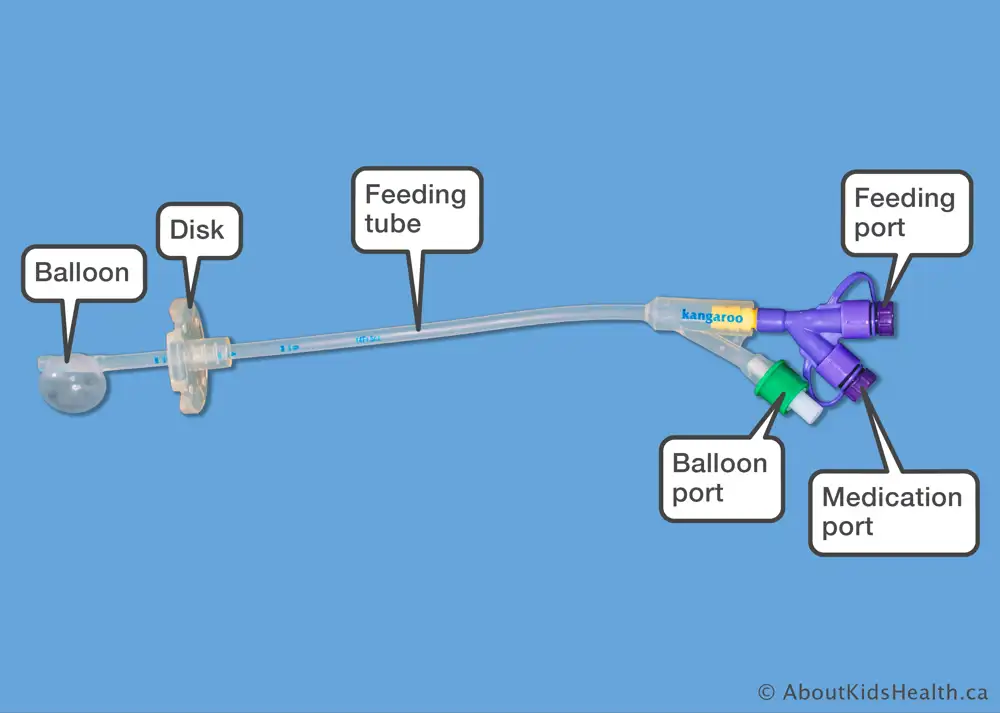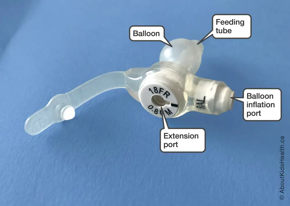 If the balloon is damaged, the feeding tube is at risk of being accidentally pulled out and needs to be securely taped down (see picture below). There is usually no need to go to the emergency department and the child can be fed and given medications via the feeding tube until arrangements are made to change the tube.