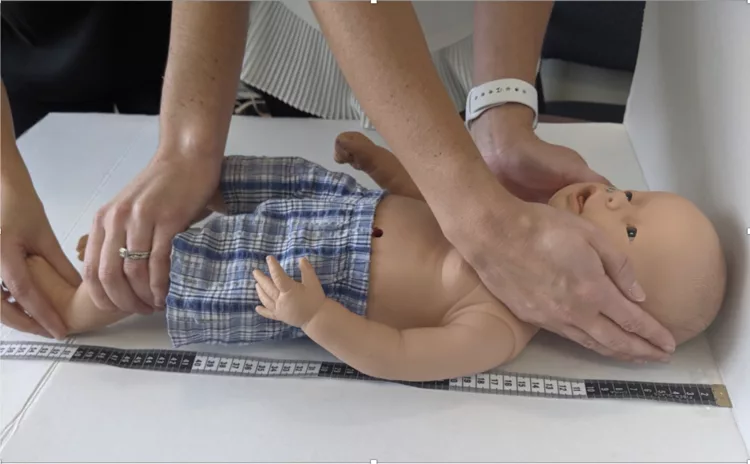 - Two people are required to accurately obtain the measurement; one to hold the infant/child’s head straight and flush to the wall, and one to fully extend the legs and flex the foot.