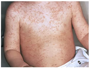- A rash that begins on the face, upper neck, and behind the ears, then spreads downward across the body to the arms, hands, legs, and feet (refer to the image below). After approximately five days, the rash diminishes in the same order it appeared.