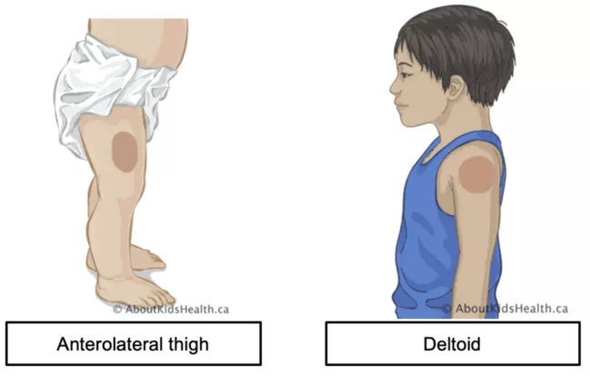 - Select an appropriate injection site, needle gauge and needle size based on the child’s age and weight.