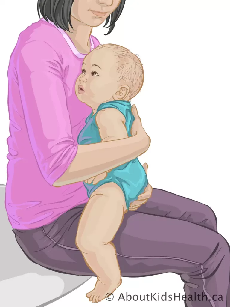 - Positioning: place the child in a position that is most comfortable. For infants and toddlers, consider using the straddle position in which they are facing their caregiver, and their limbs are on each side (as shown in the image below). For older children, let them choose the best position for them (e.g., on a caregiver’s lap, sitting upright on a chair).