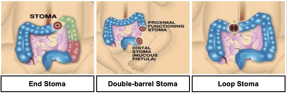- Colostomy: creates an opening that connects the colon (large intestine) to the abdomen